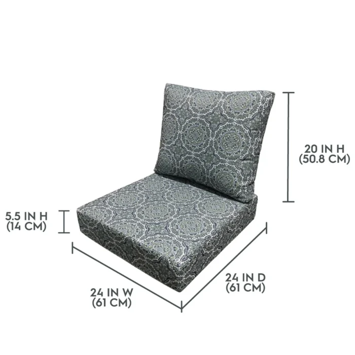 - 2-Piece Cushion Set; Includes Back: 20” L x 24” W x 7” H / Seat: 24” L x 24” W x 5.5” H