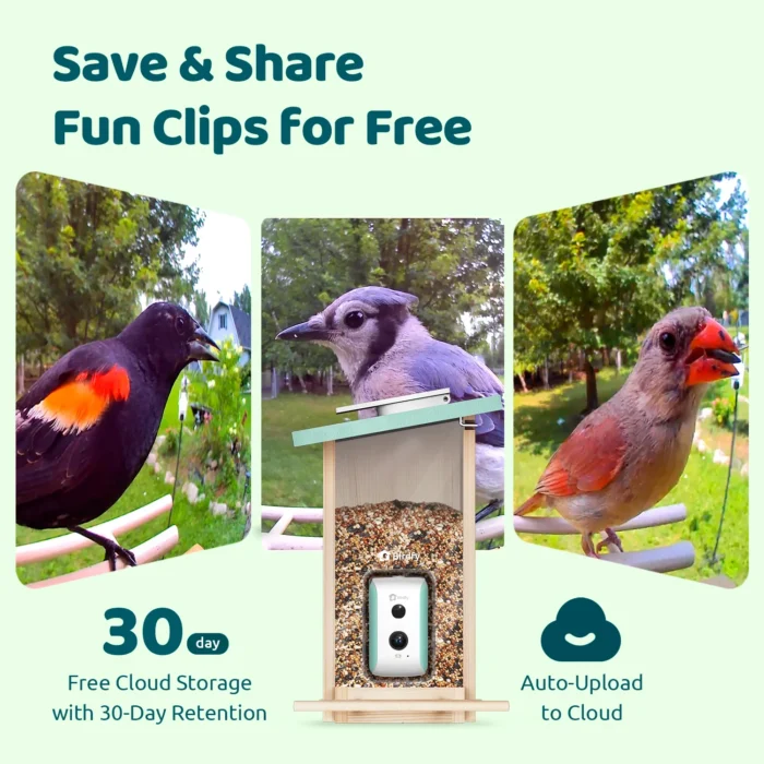 • Real-time Bird Watching: Receive instant notifications when birds visit, directly through the Birdfy app. Automatic recordings are stored in lifetime free cloud storage (data retention up to 30 days).